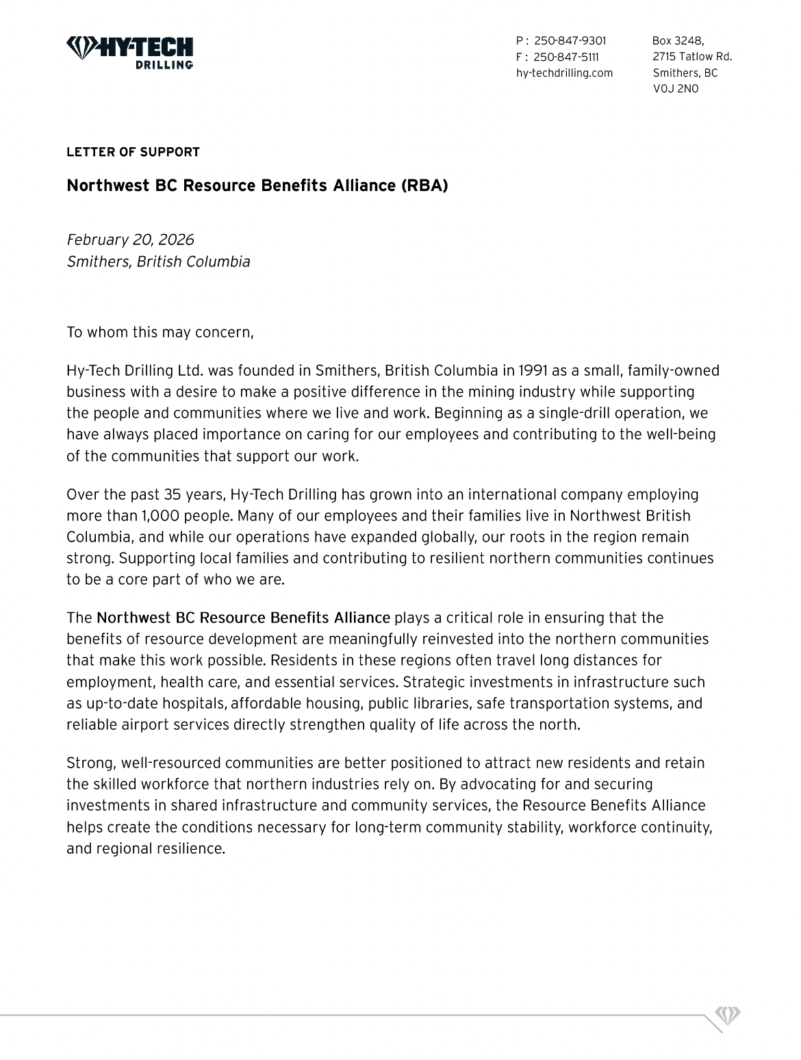 For these reasons, Hy-Tech Drilling Ltd. proudly supports the continued work of the Northwest BC Resource Benefits Alliance and the positive, lasting impact it has across Northwest British Columbia.
