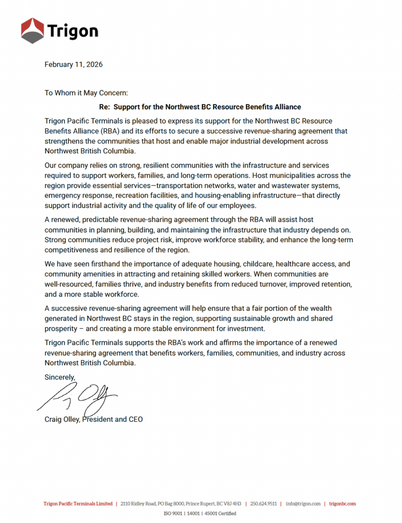 Trigon Pacific Terminals supports the RBA’s work and affirms the importance of a renewed revenue-sharing agreement that benefits workers, families, communities, and industry across Northwest British Columbia.