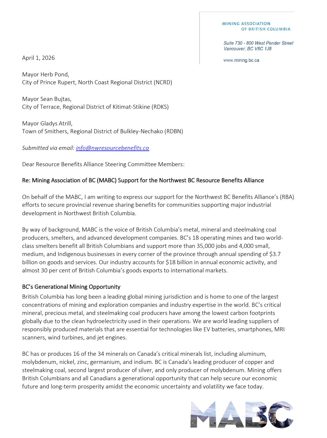 On behalf of the MABC, I am writing to express our support for the Northwest BC Benefits Alliance’s (RBA) efforts to secure provincial revenue sharing benefits for communities supporting major industrial development in Northwest British Columbia.
