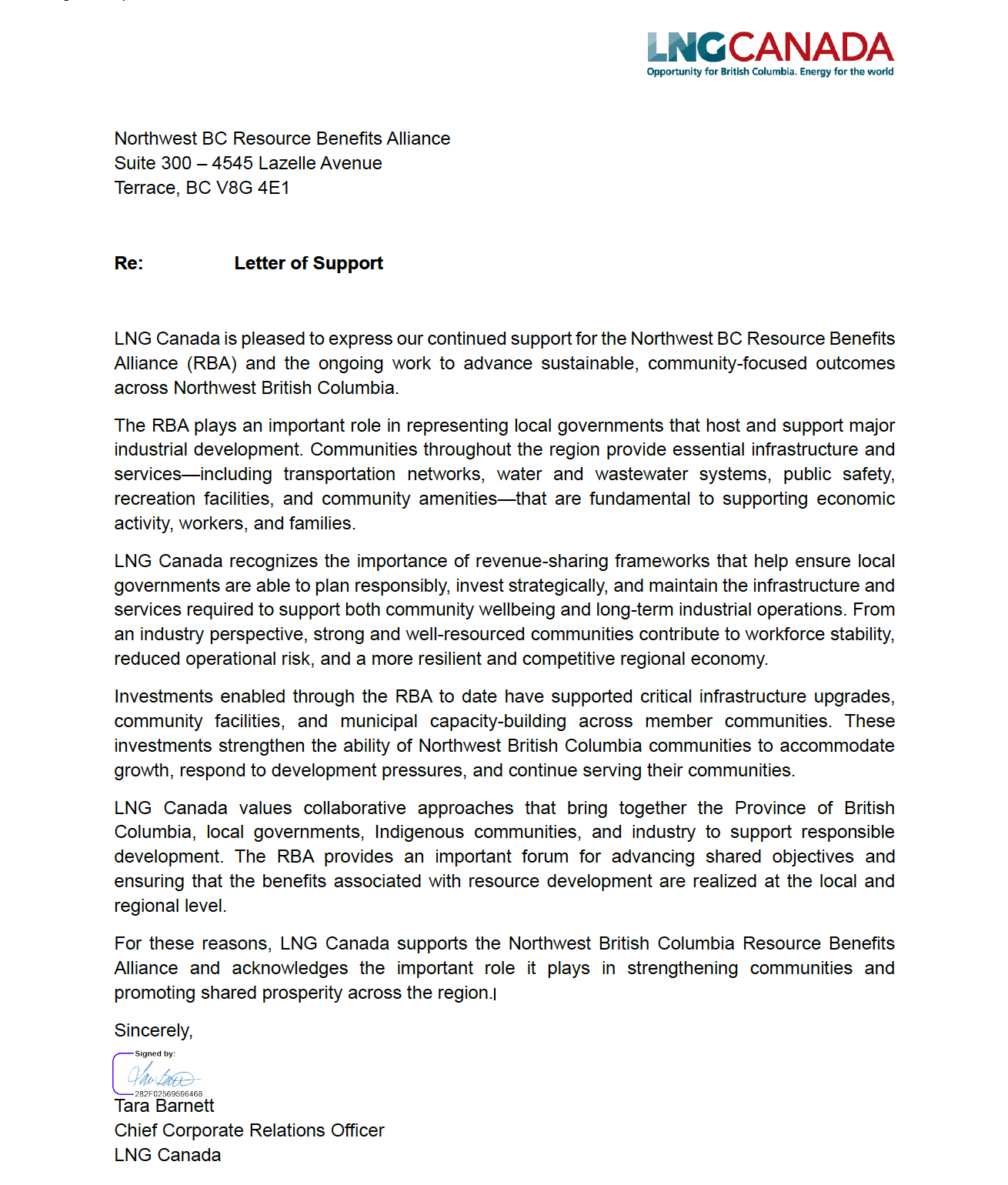 LNG Canada is pleased to express our continued support for the Northwest BC Resource Benefits Alliance (RBA) and the ongoing work to advance sustainable, community-focused outcomes across Northwest British Columbia.