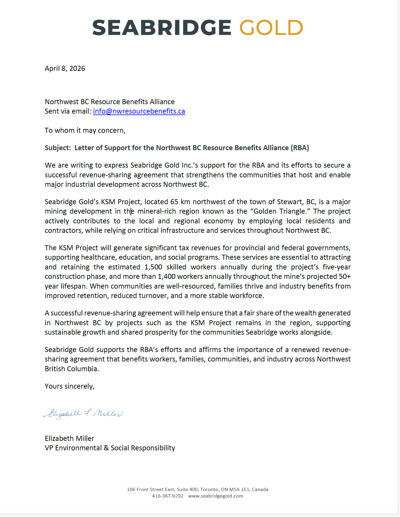 We are writing to express Seabridge Gold Inc.’s support for the RBA and its efforts to secure a successful revenue-sharing agreement that strengthens the communities that host and enable major industrial development across Northwest BC.